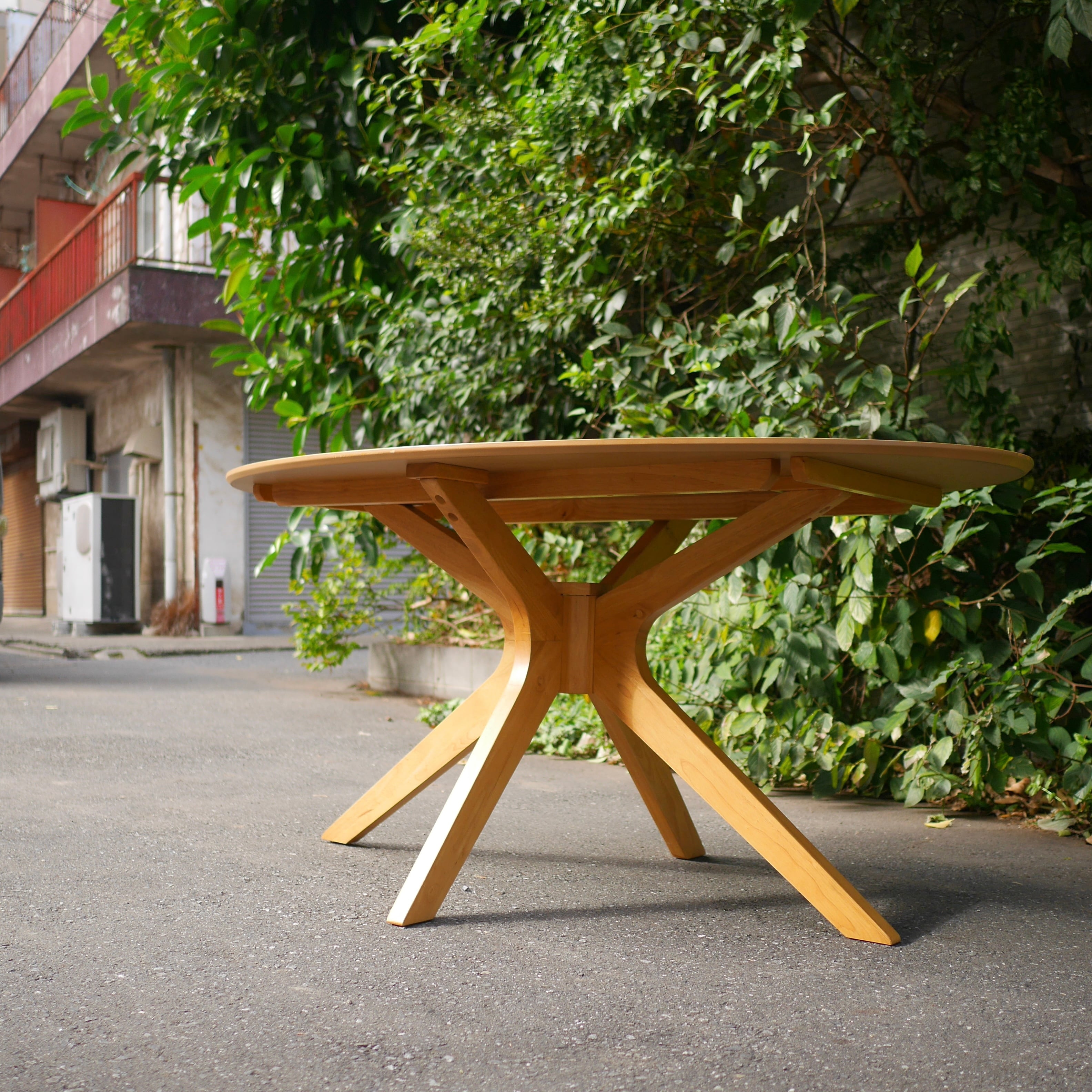楕円形のやわらかなフォルムが魅力の木製テーブル。
