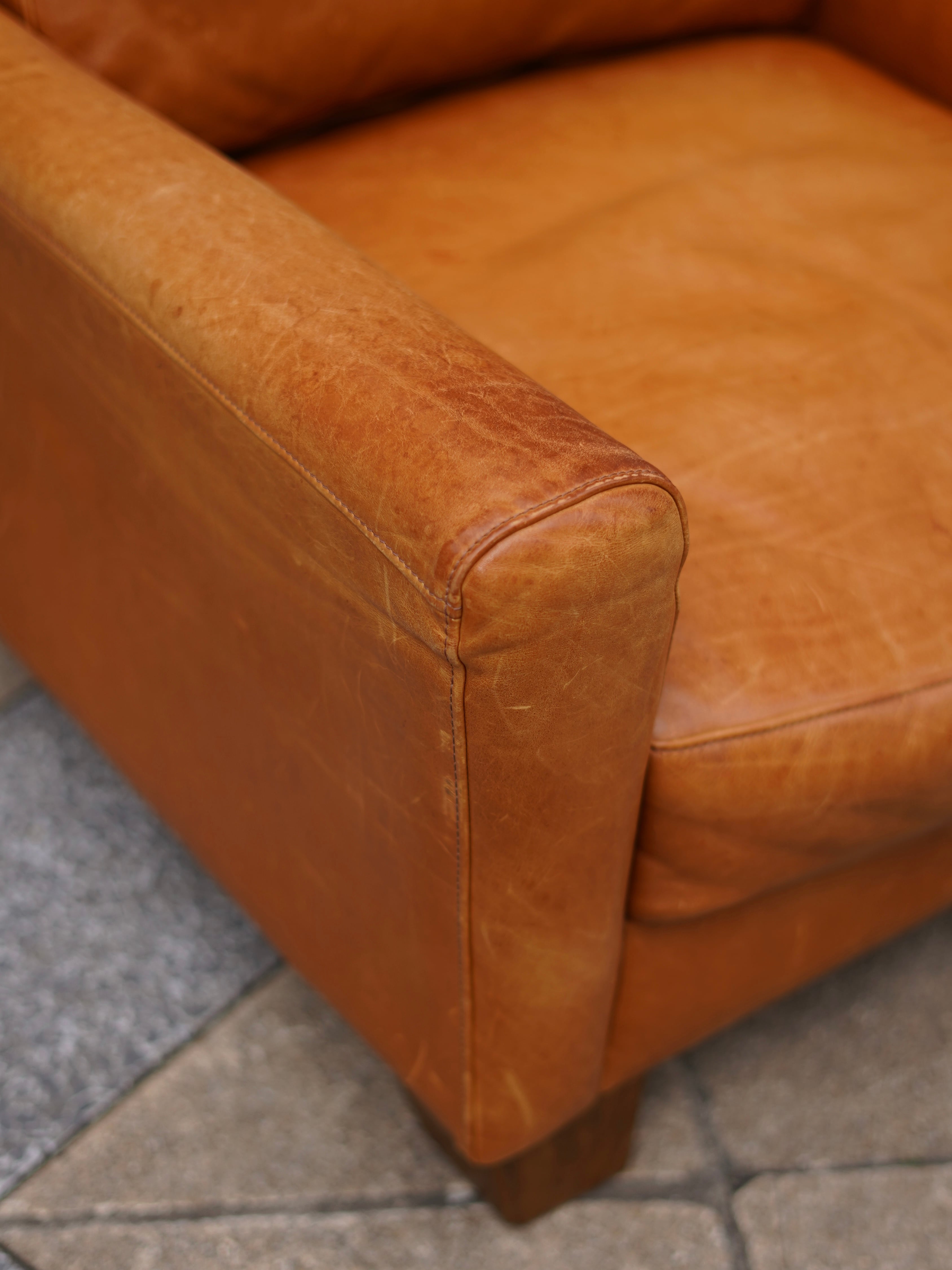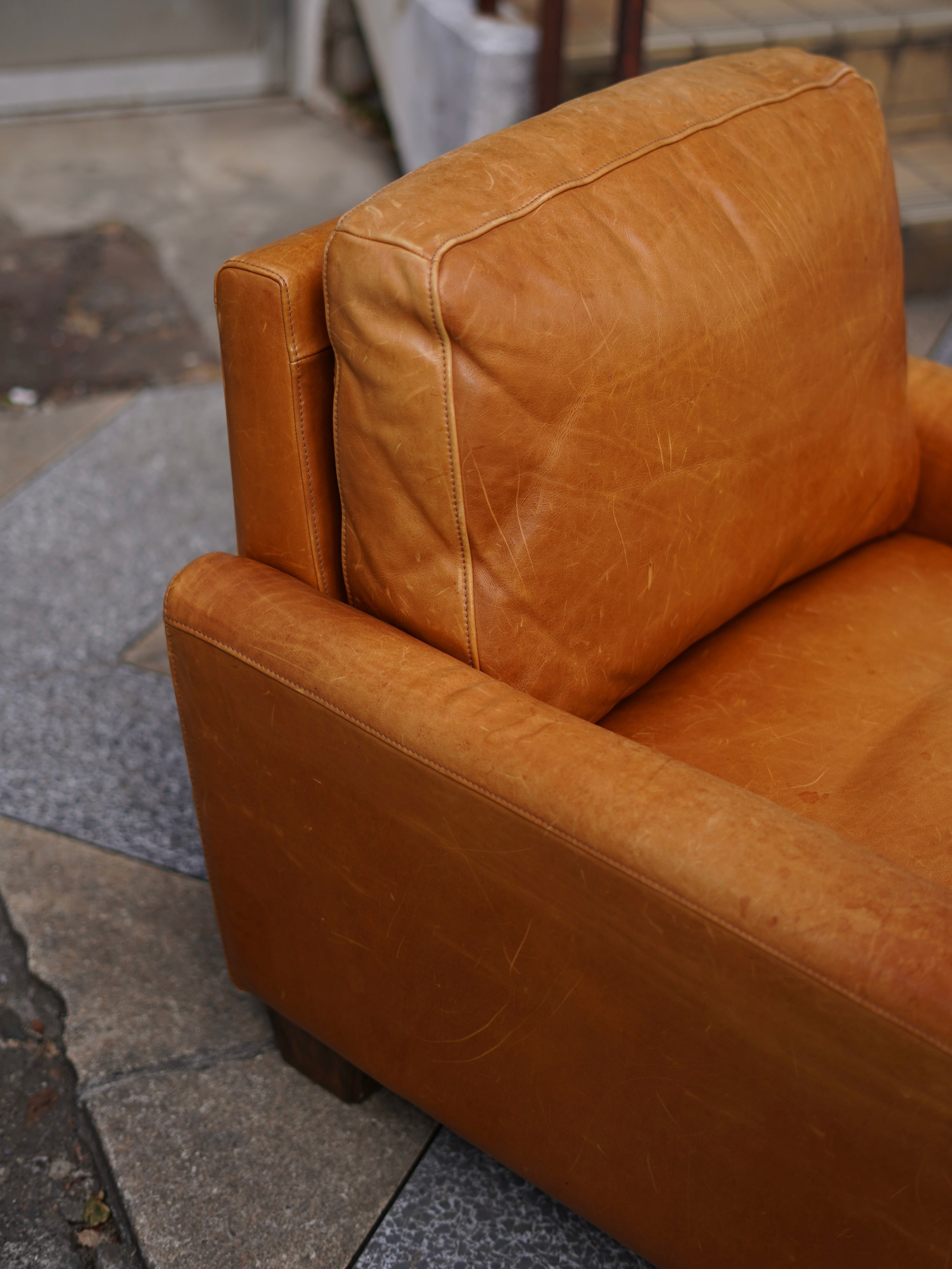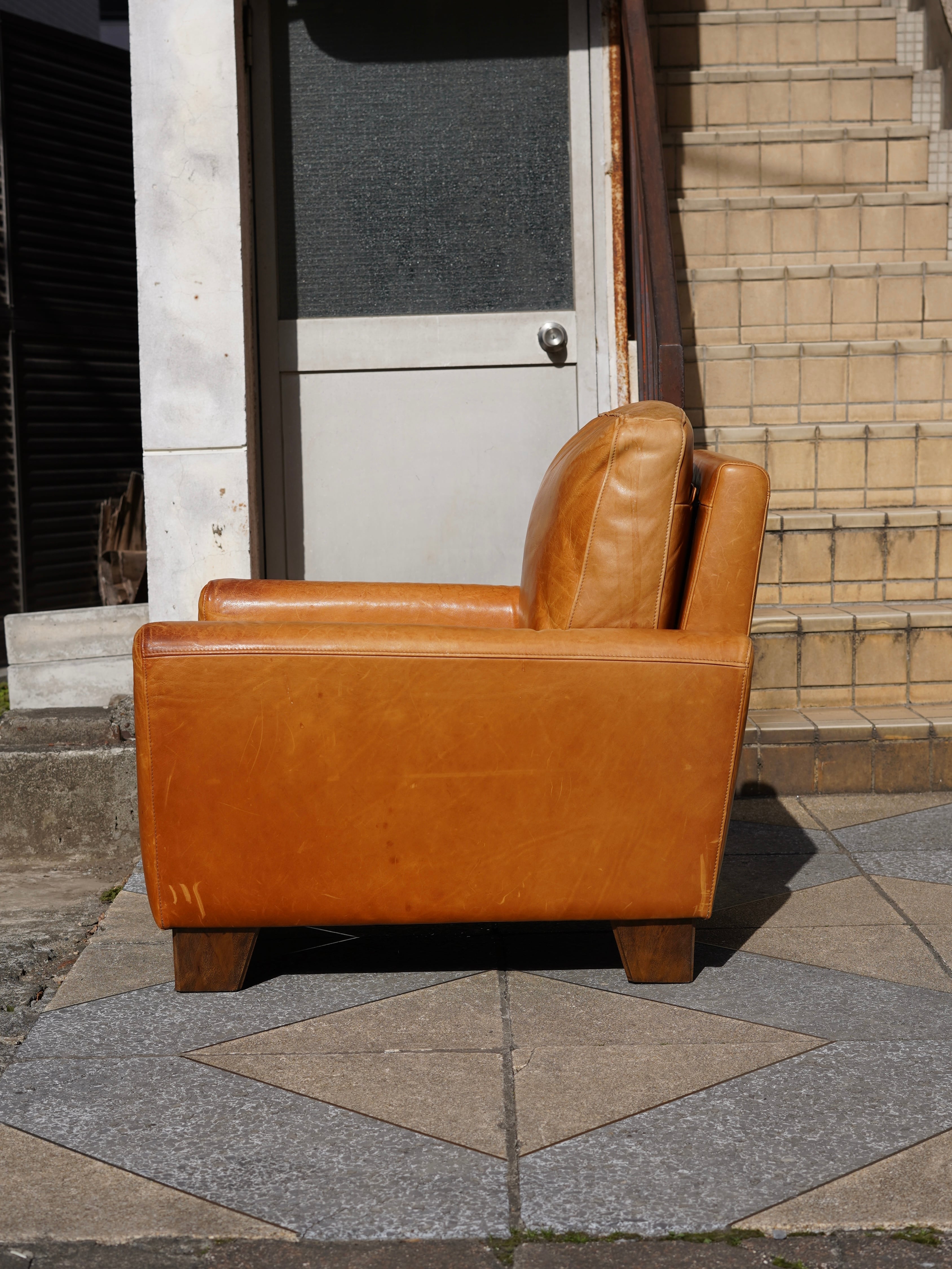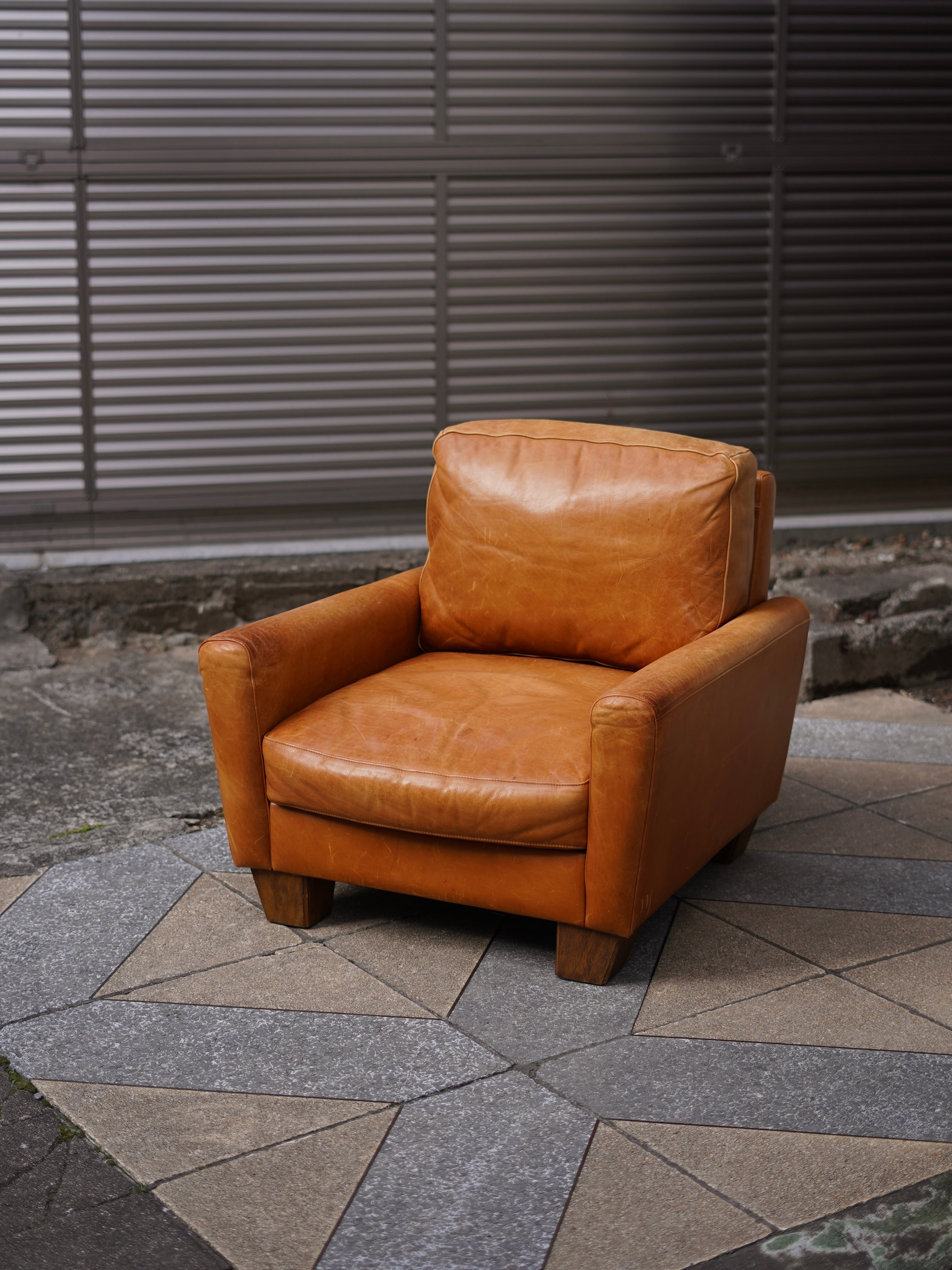 古き良き時代のアメリカンヴィンテージソファを彷彿とさせる、どっしりとしたフォルムが特徴の1人掛けソファ。レザーならではの風合い豊かな経年変化を楽しめ、使い込むほどにさらに味わいが深まります。