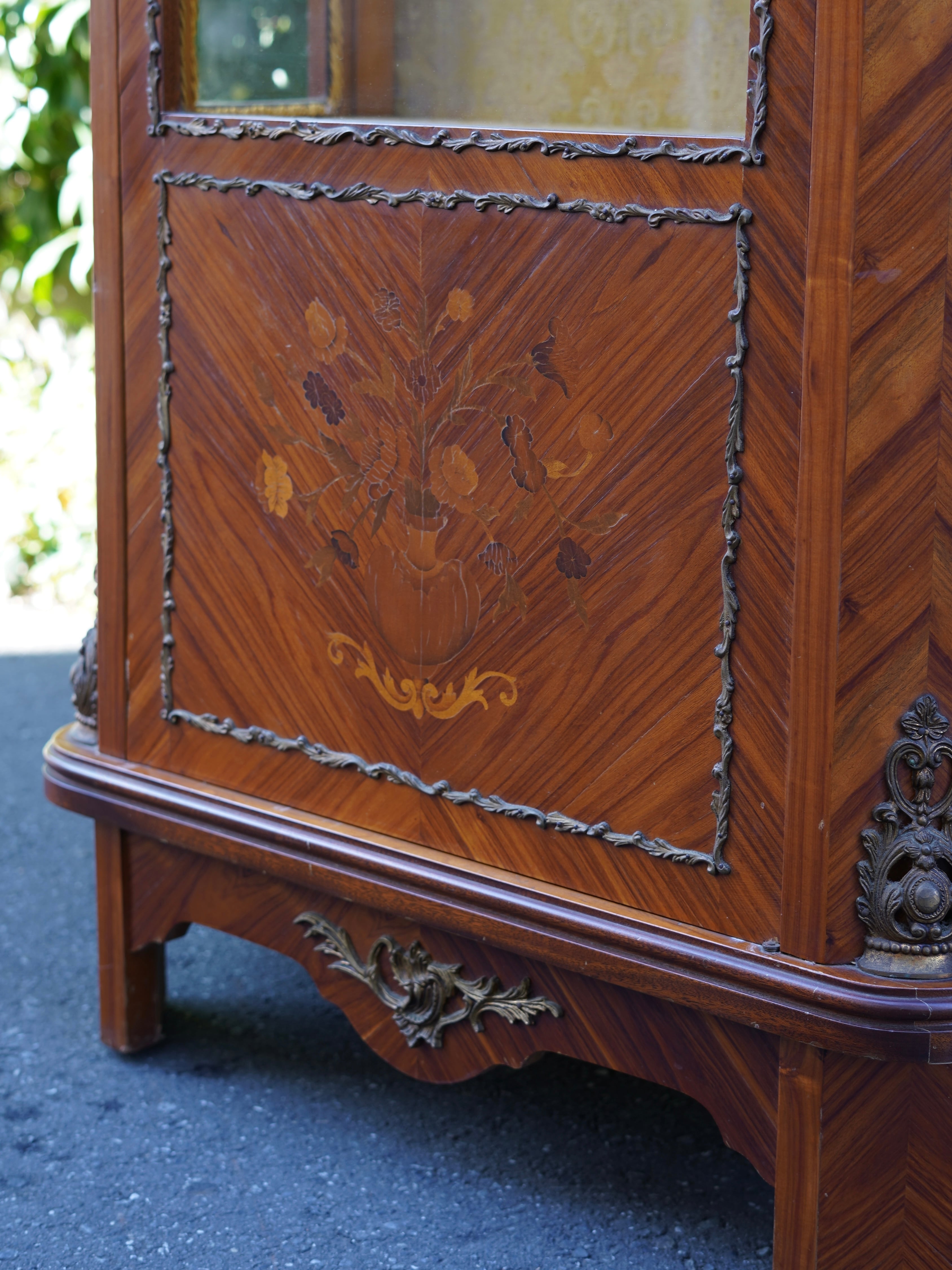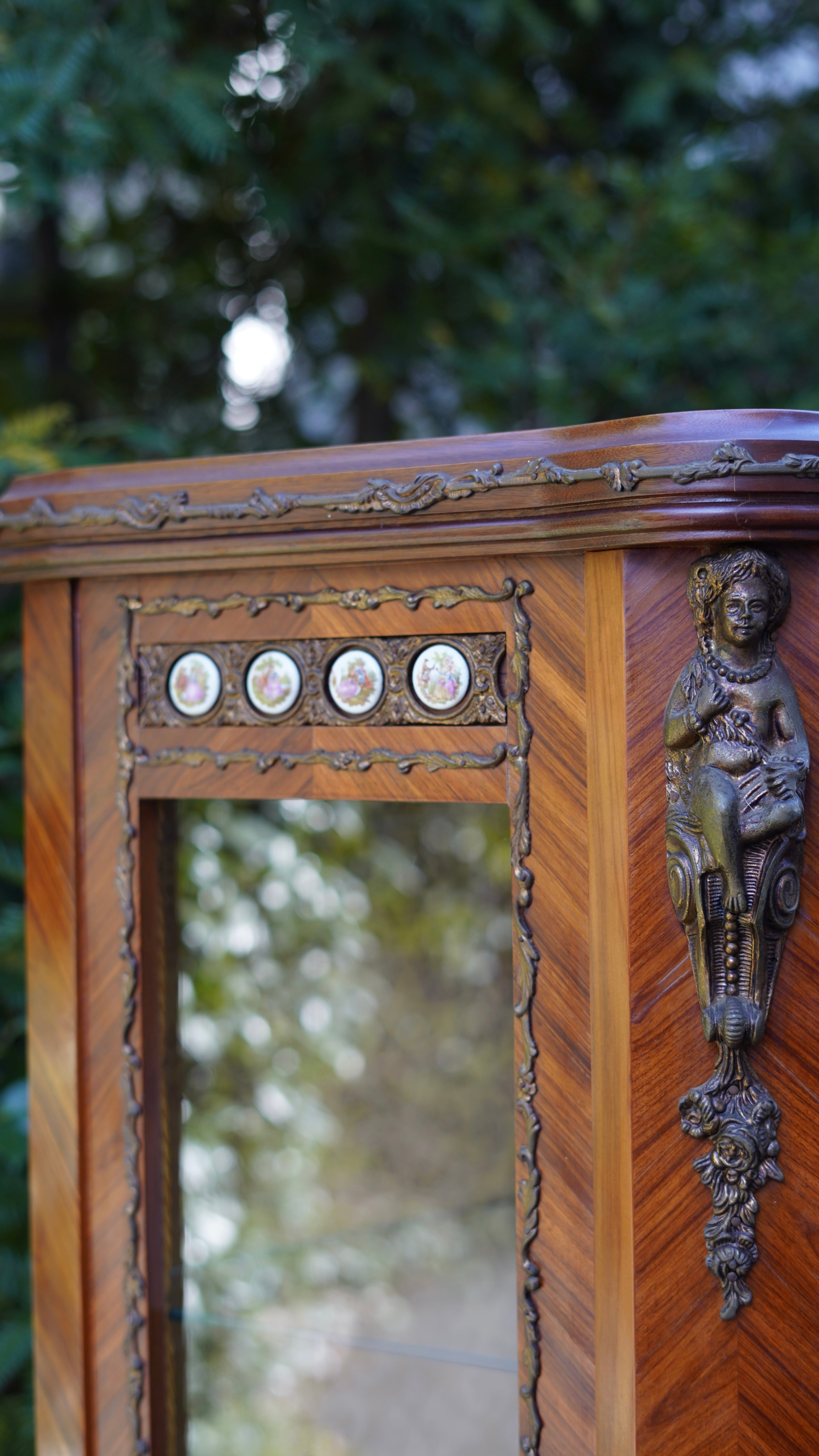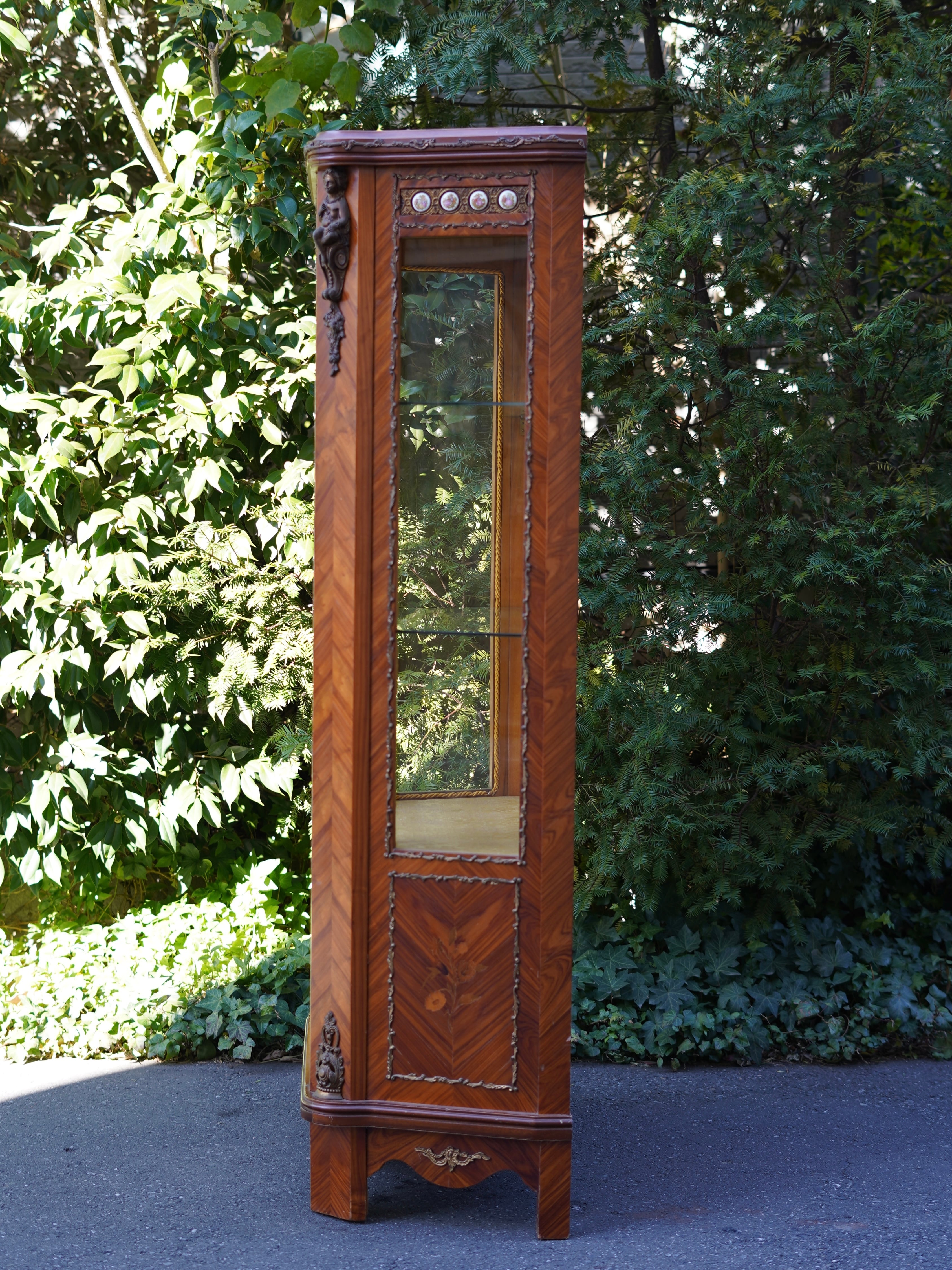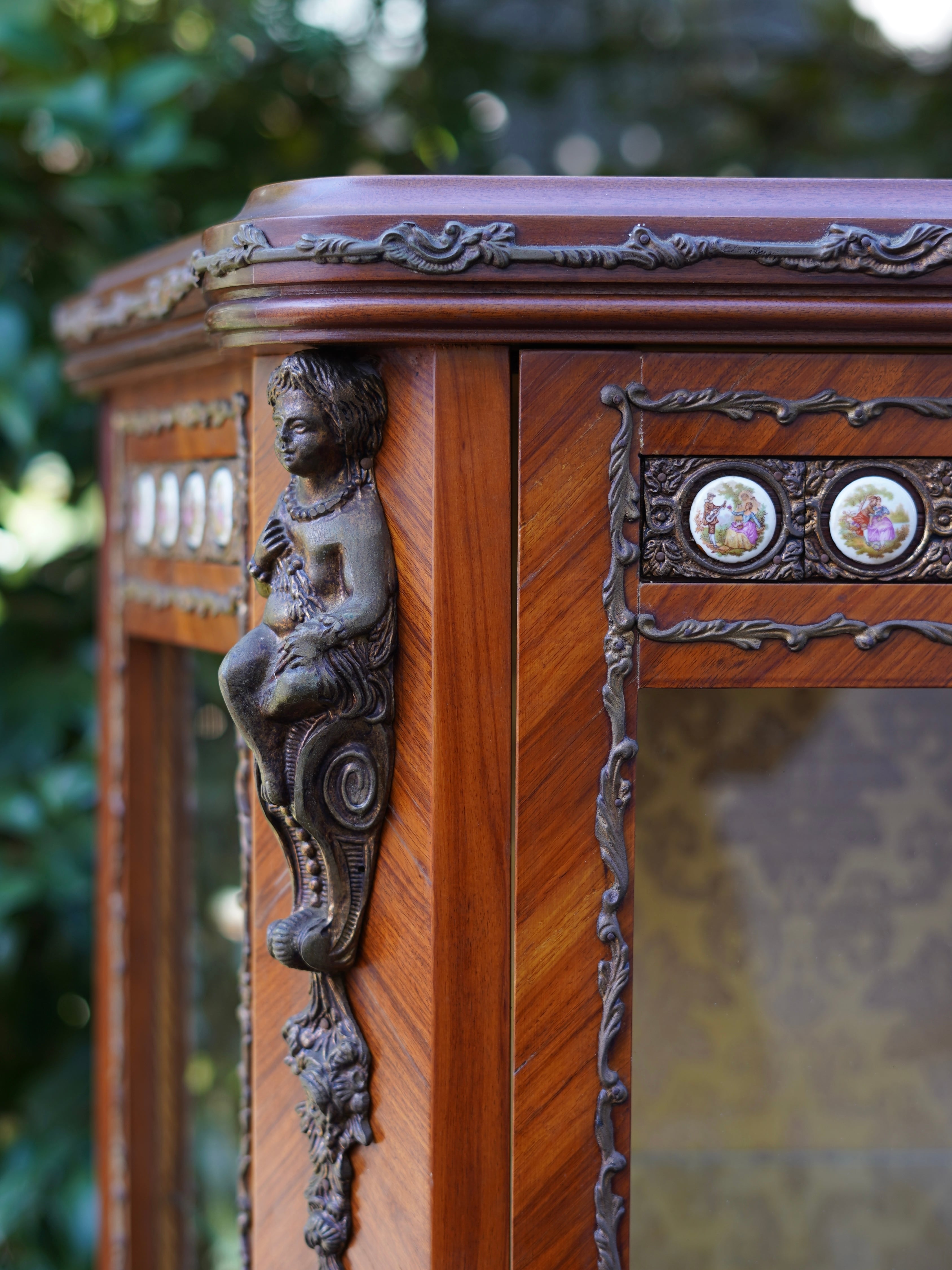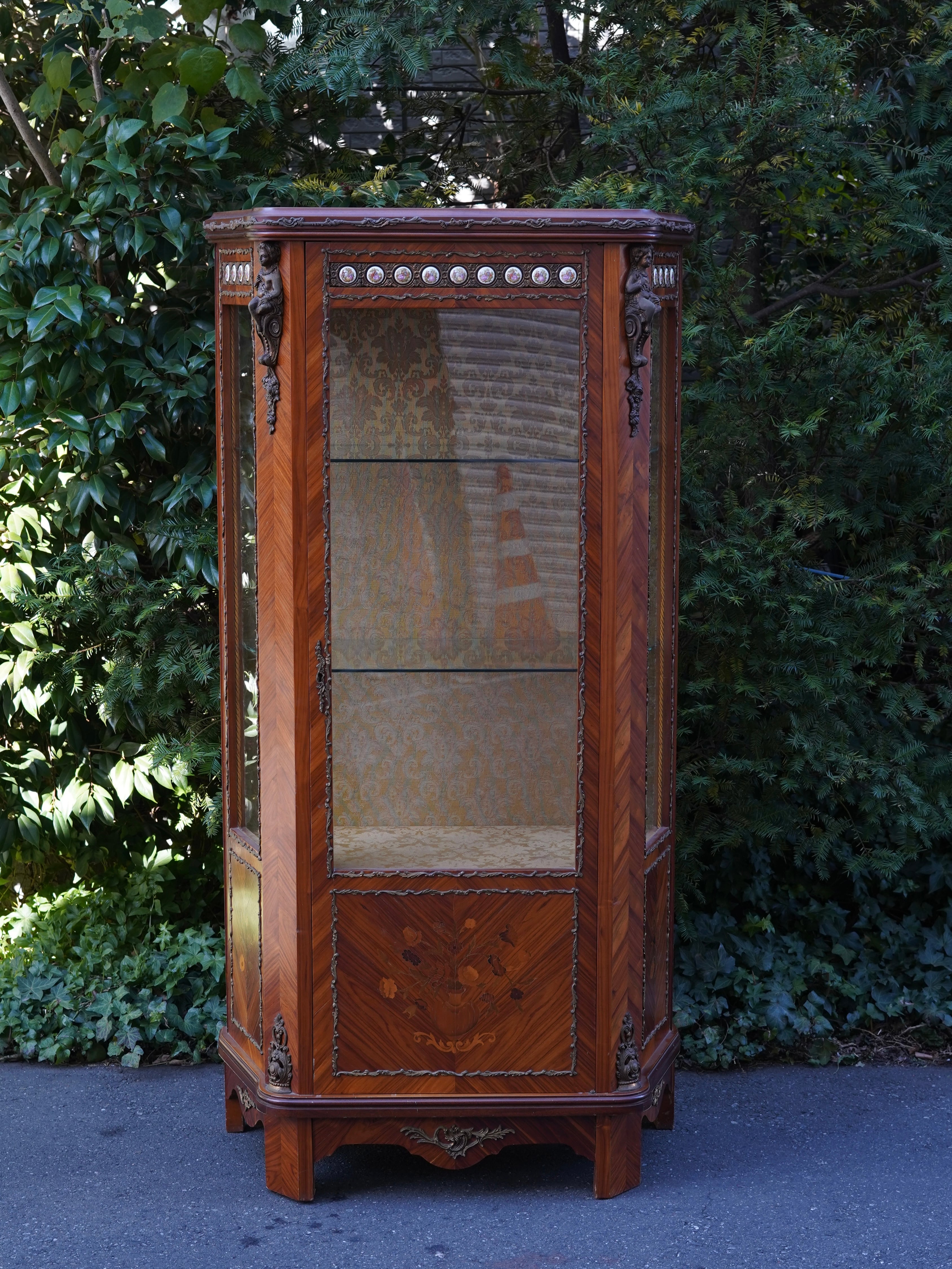 繊細なデザインの真鍮のモールディングや象嵌細工、陶板装飾などが施された優雅な雰囲気のキャビネット。細部まで華麗な装飾で飾られ、ガラス棚にお好きなディスプレイを楽しんでいただける華やかで豪華なお品です。