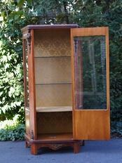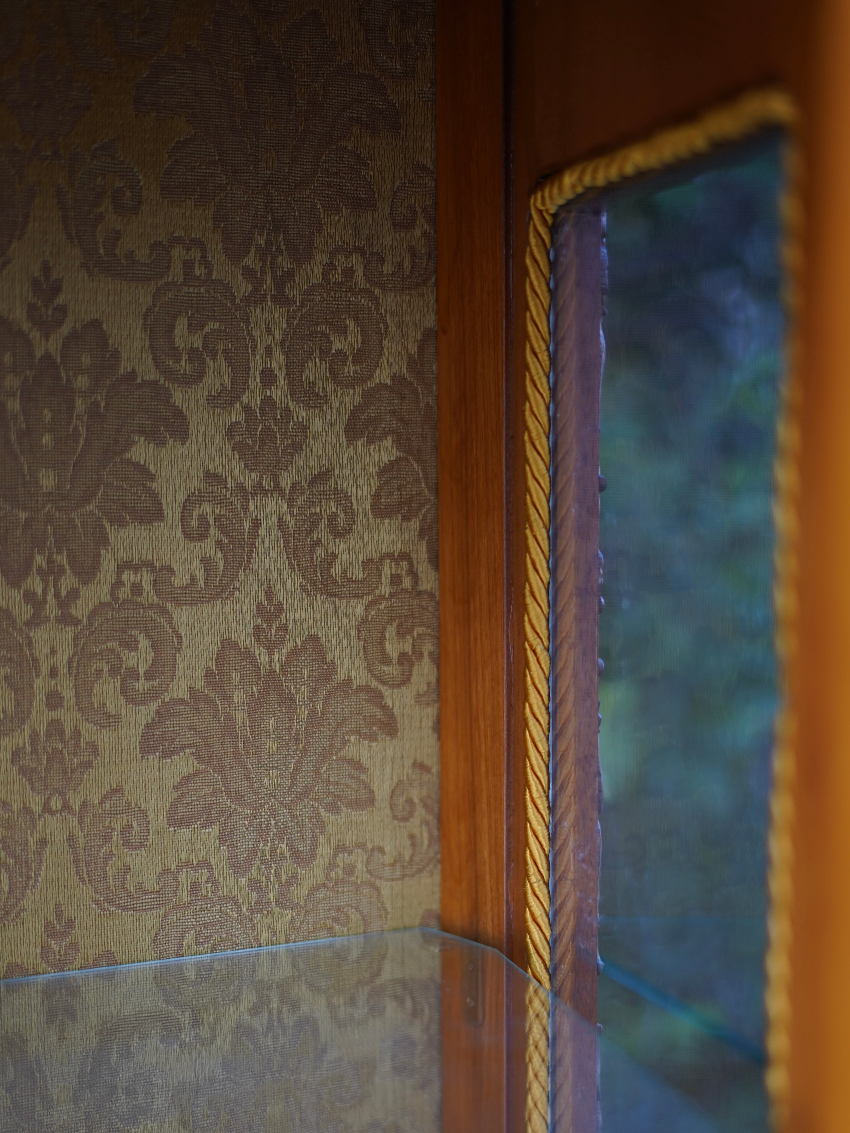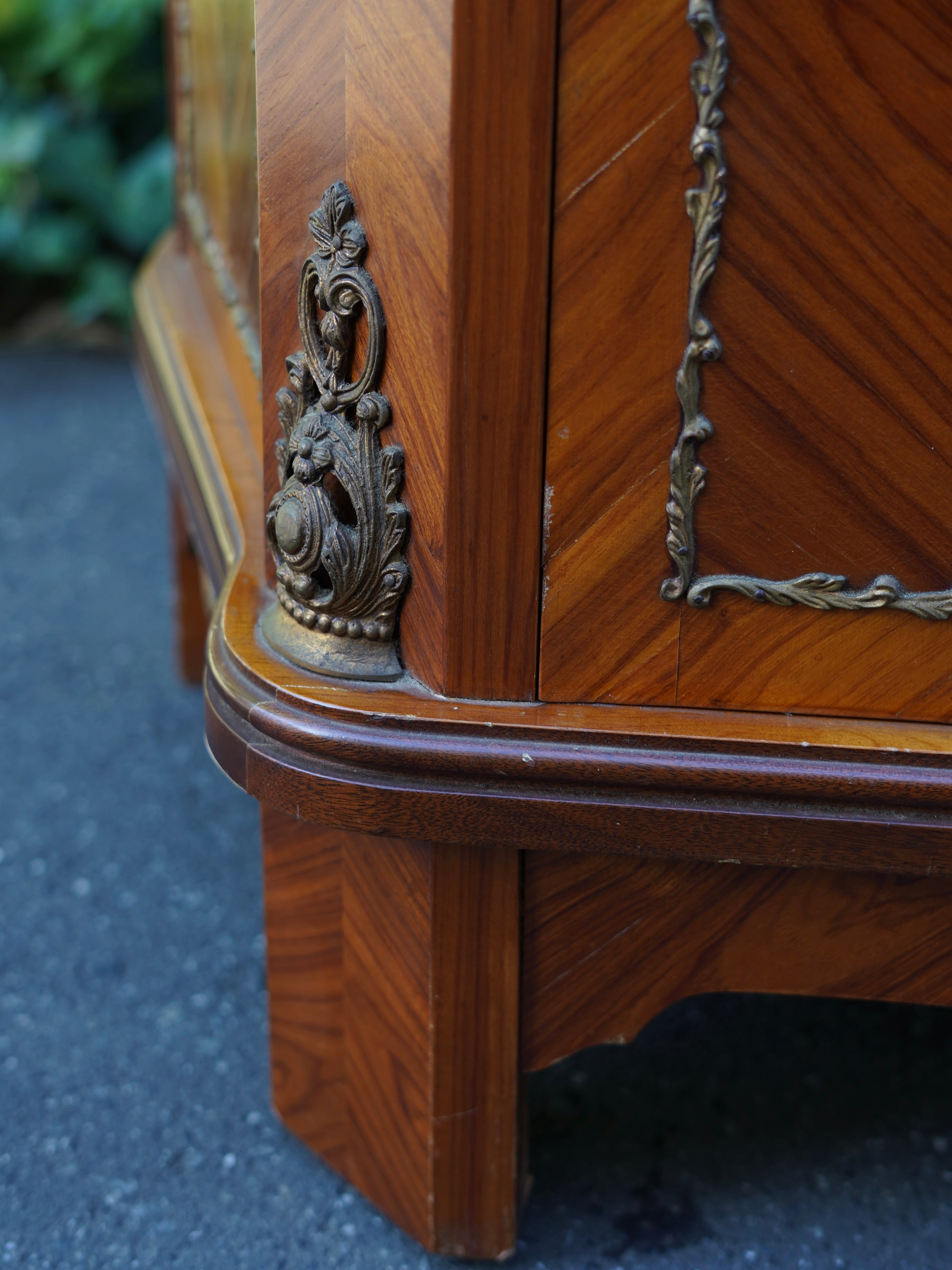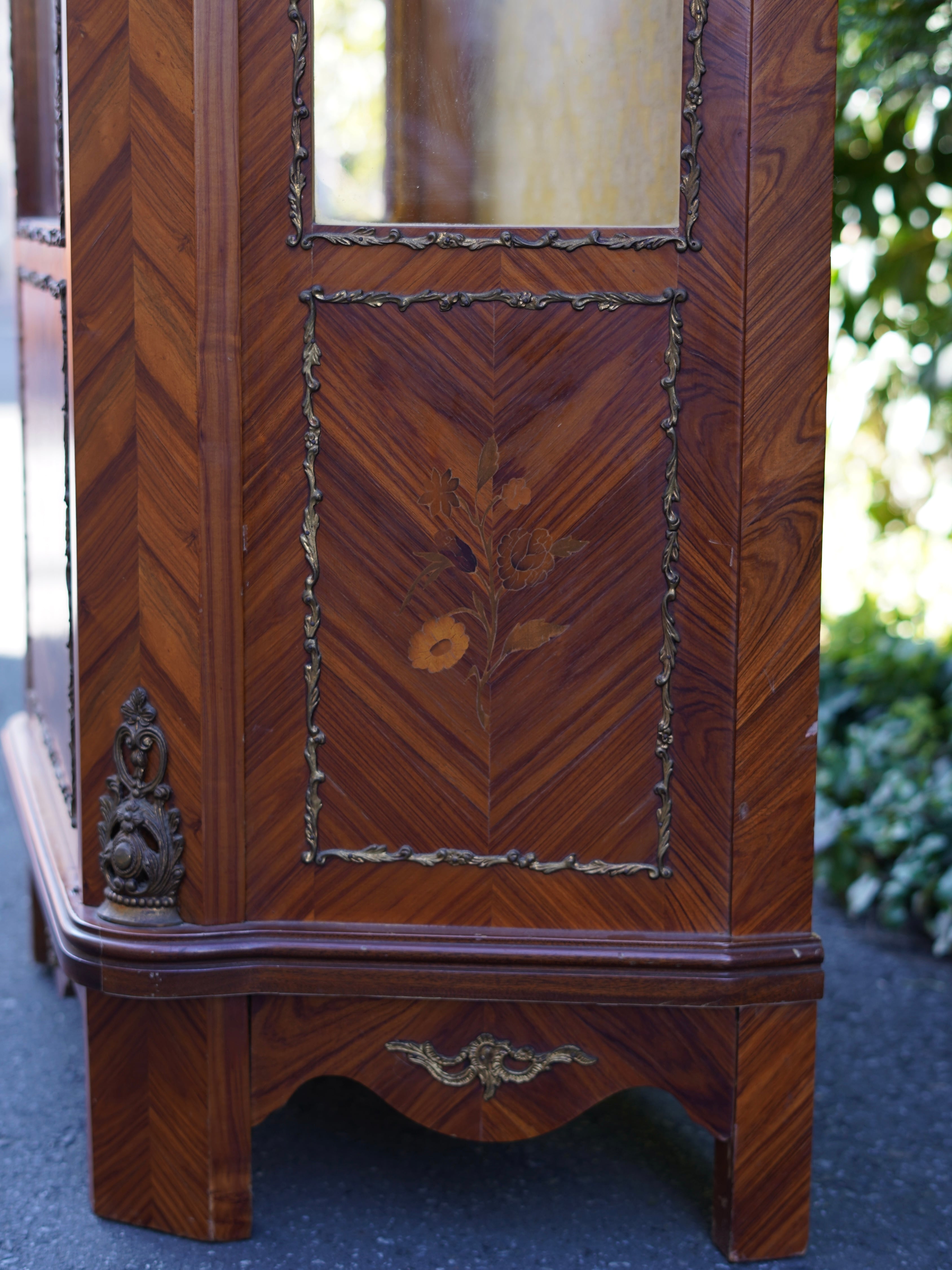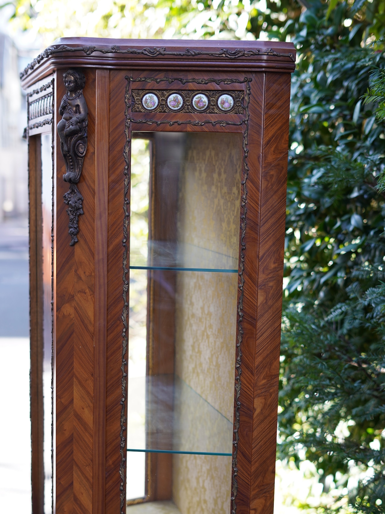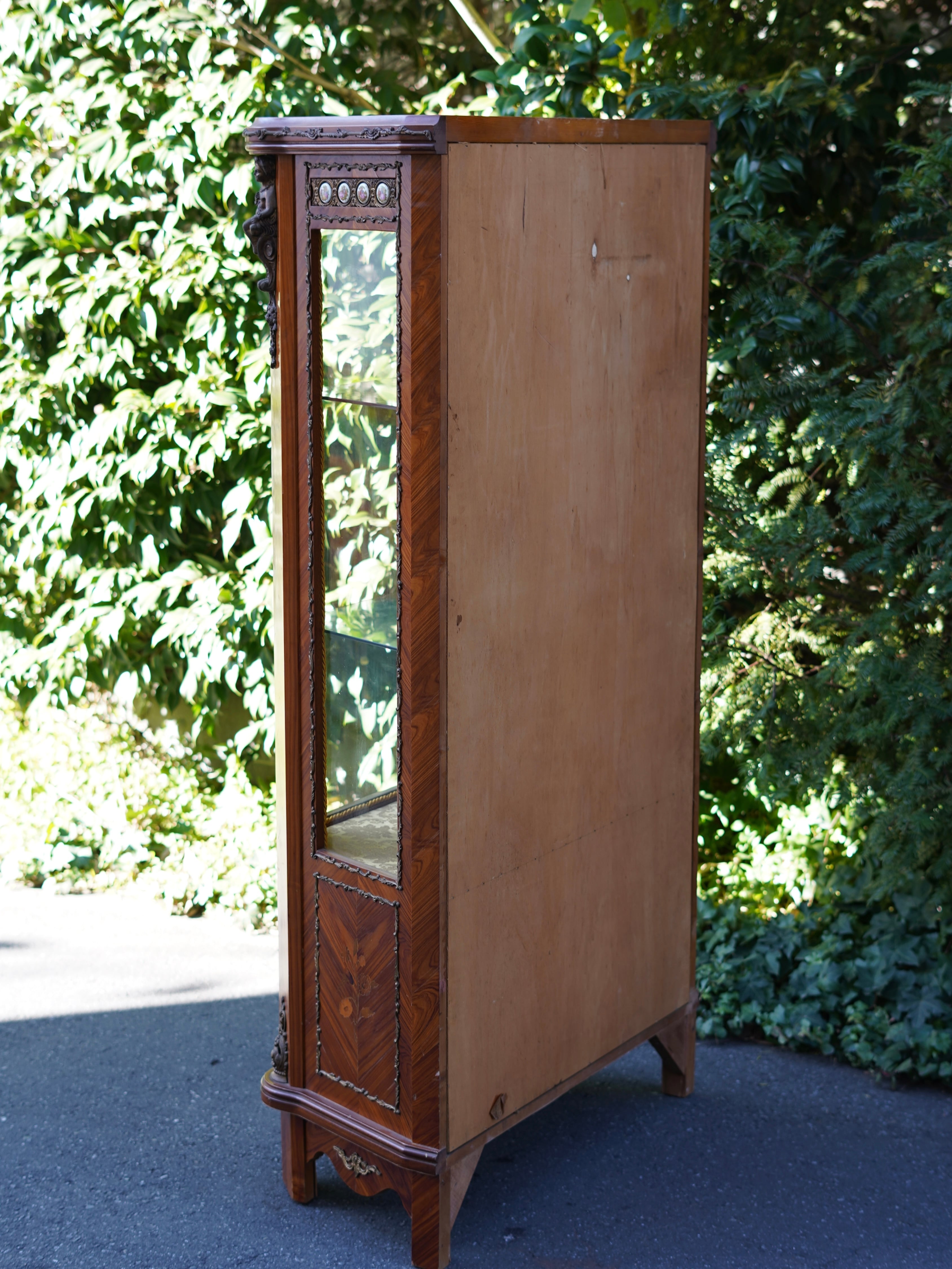 繊細なデザインの真鍮のモールディングや象嵌細工、陶板装飾などが施された優雅な雰囲気のキャビネット。細部まで華麗な装飾で飾られ、ガラス棚にお好きなディスプレイを楽しんでいただける華やかで豪華なお品です。