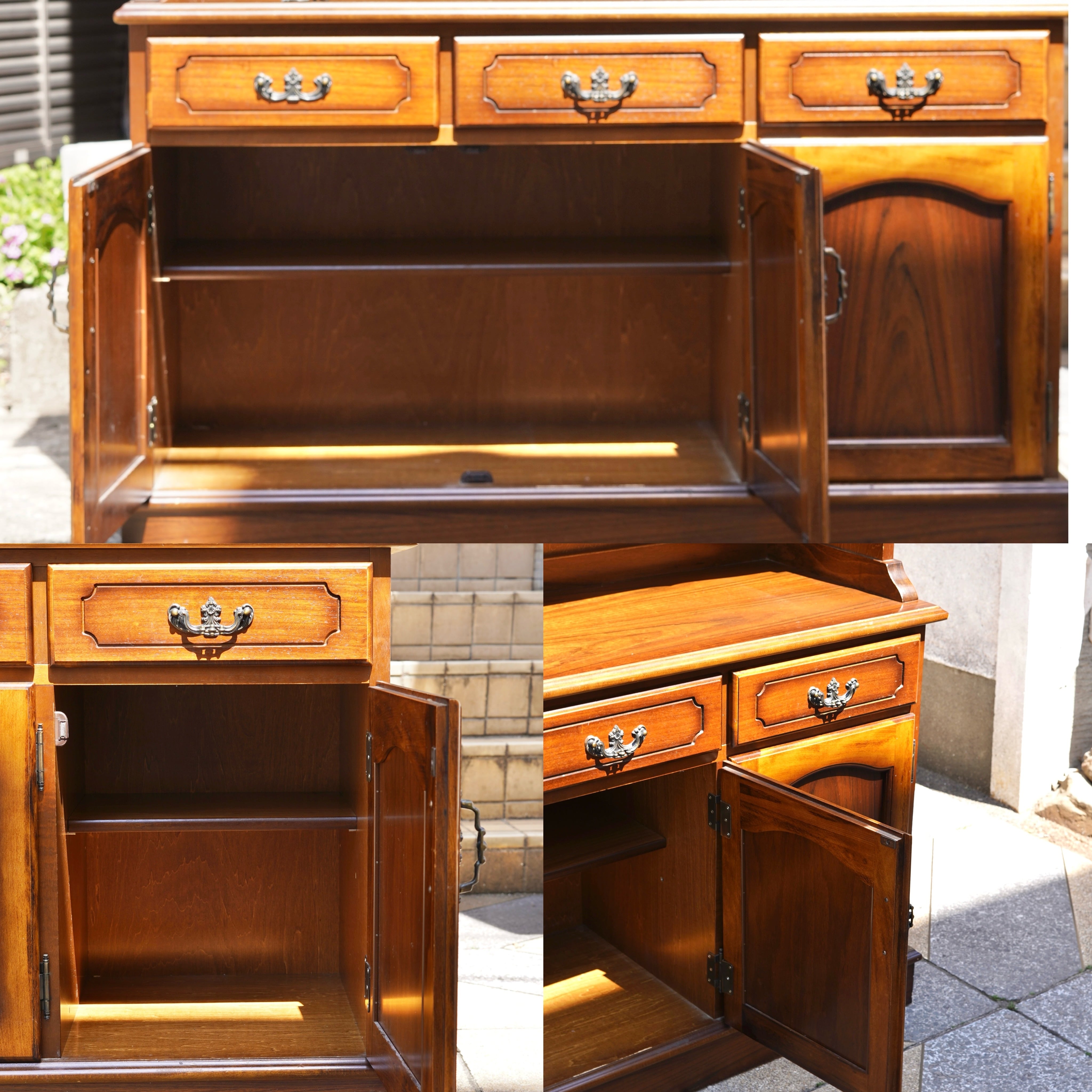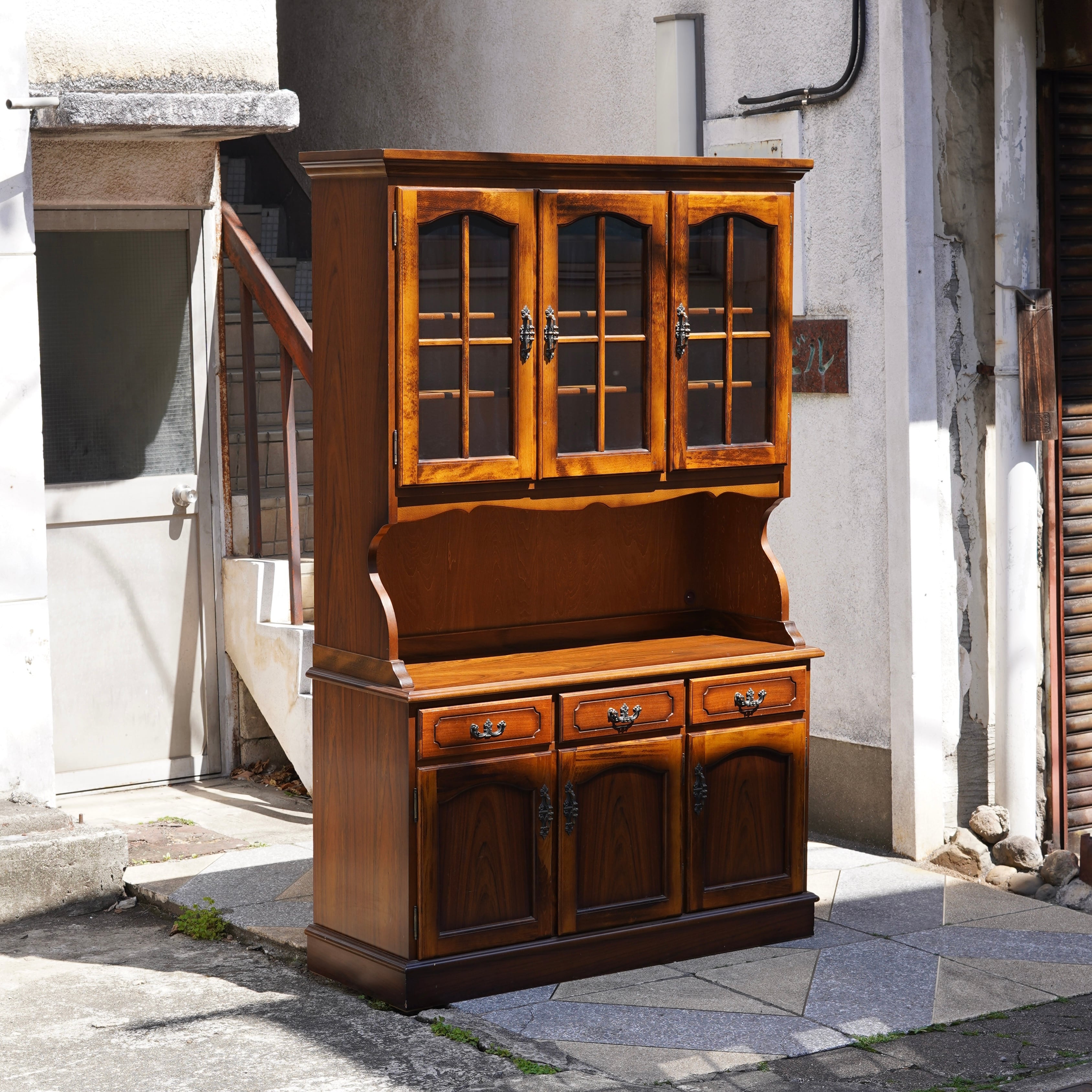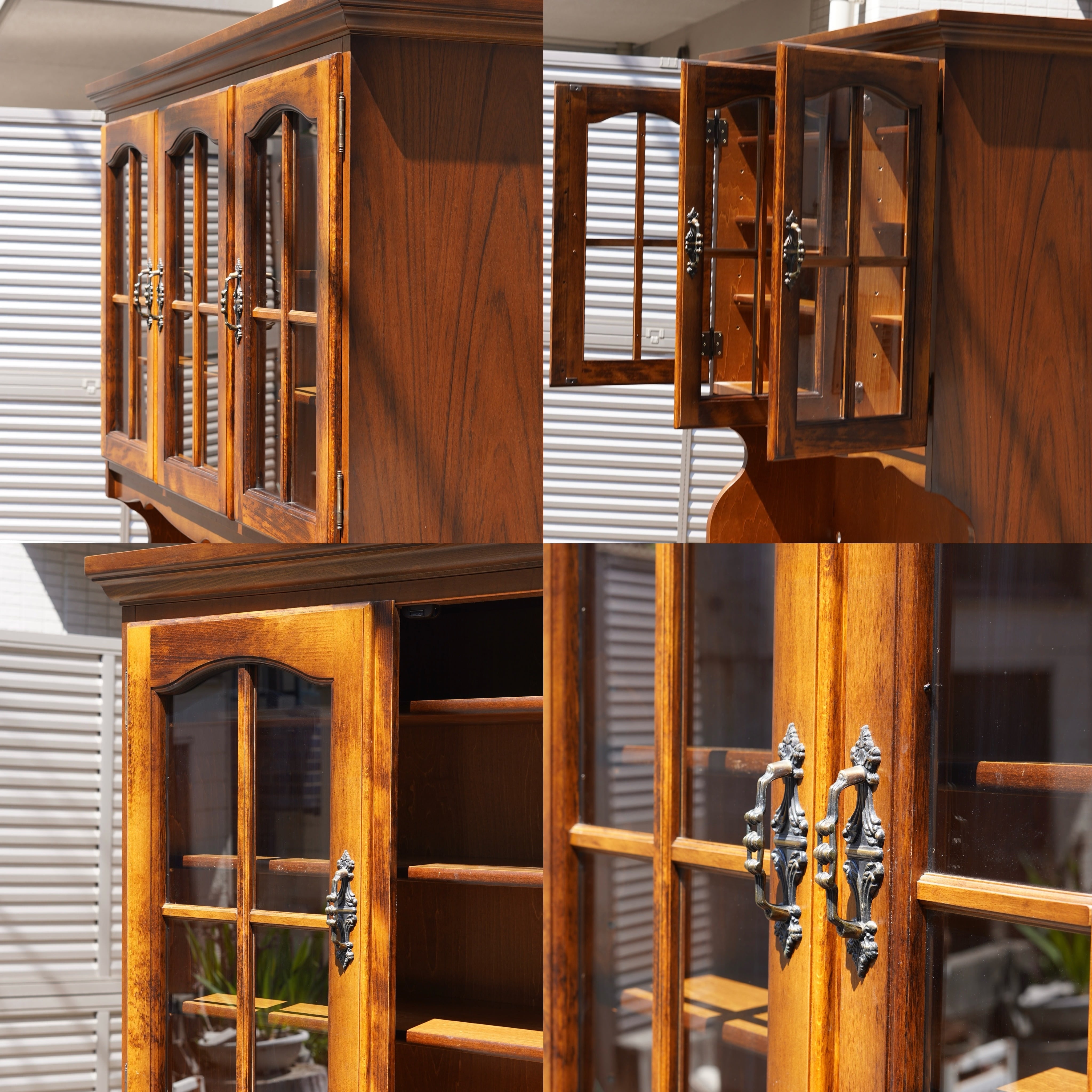木目の色の移ろいや滑らかなアーチ、クラシカルな金具は華やかでありながらどこか懐かしく、こころ落ち着く佇まいです。この大きな存在の棚にたくさんの食器を大切に守ってもらいたい。