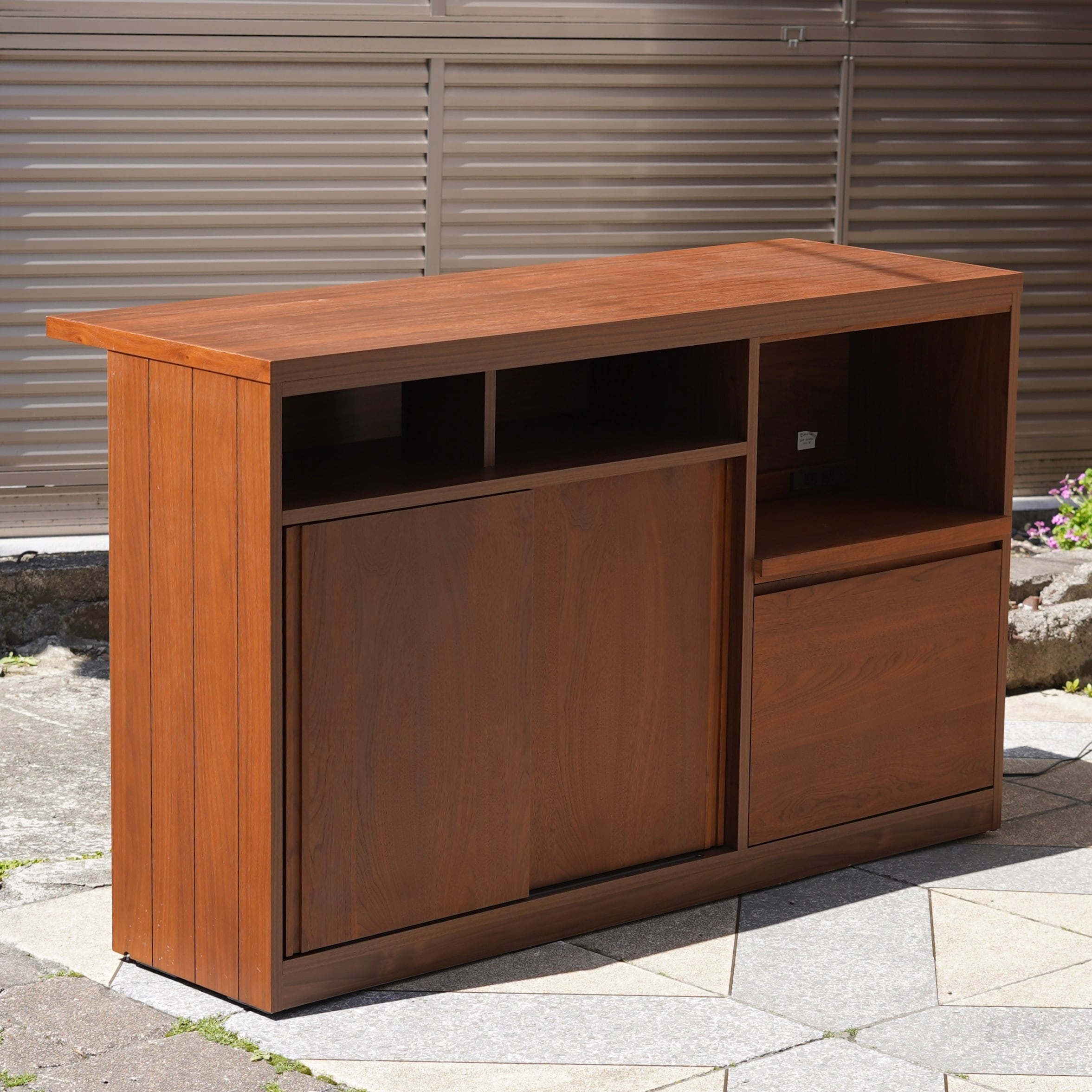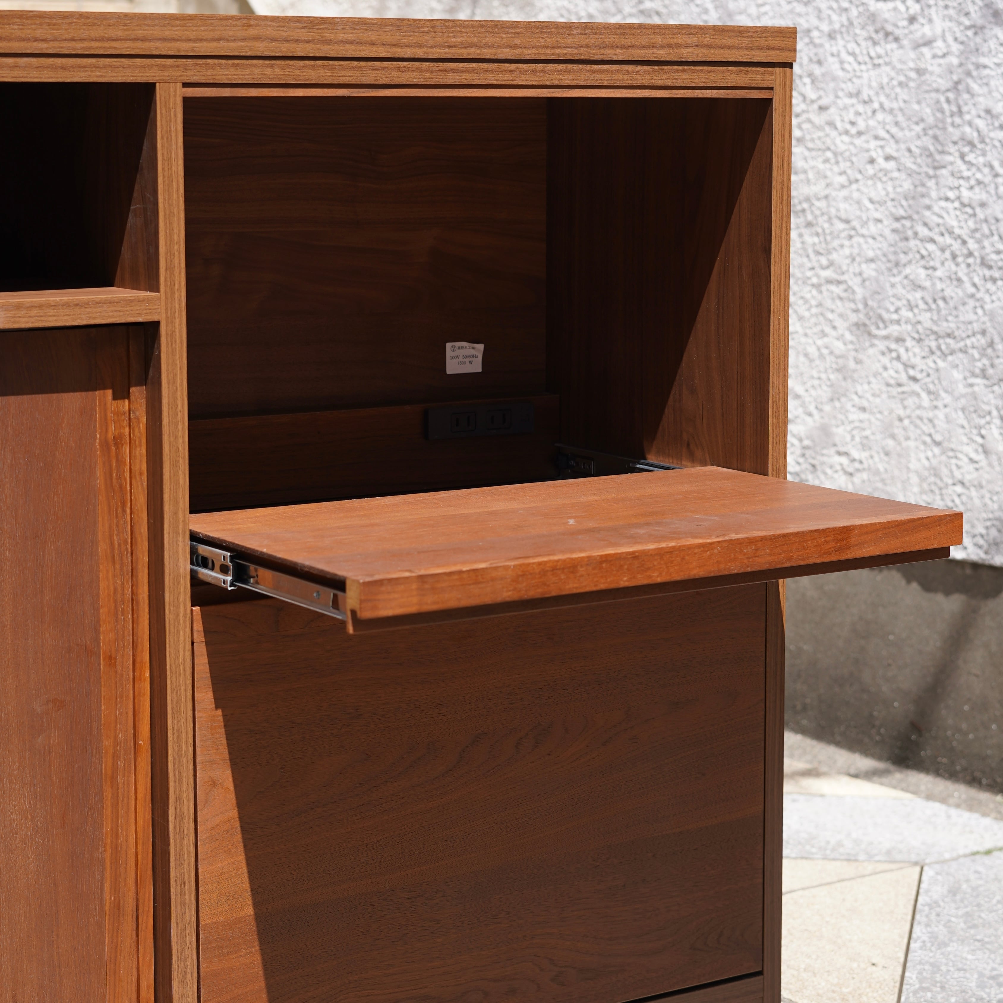 シェフ側?オーナーサイド?にレールで引き出せる家電収納があり、コンセントが2口付いているので使う家電も幅が広がります。