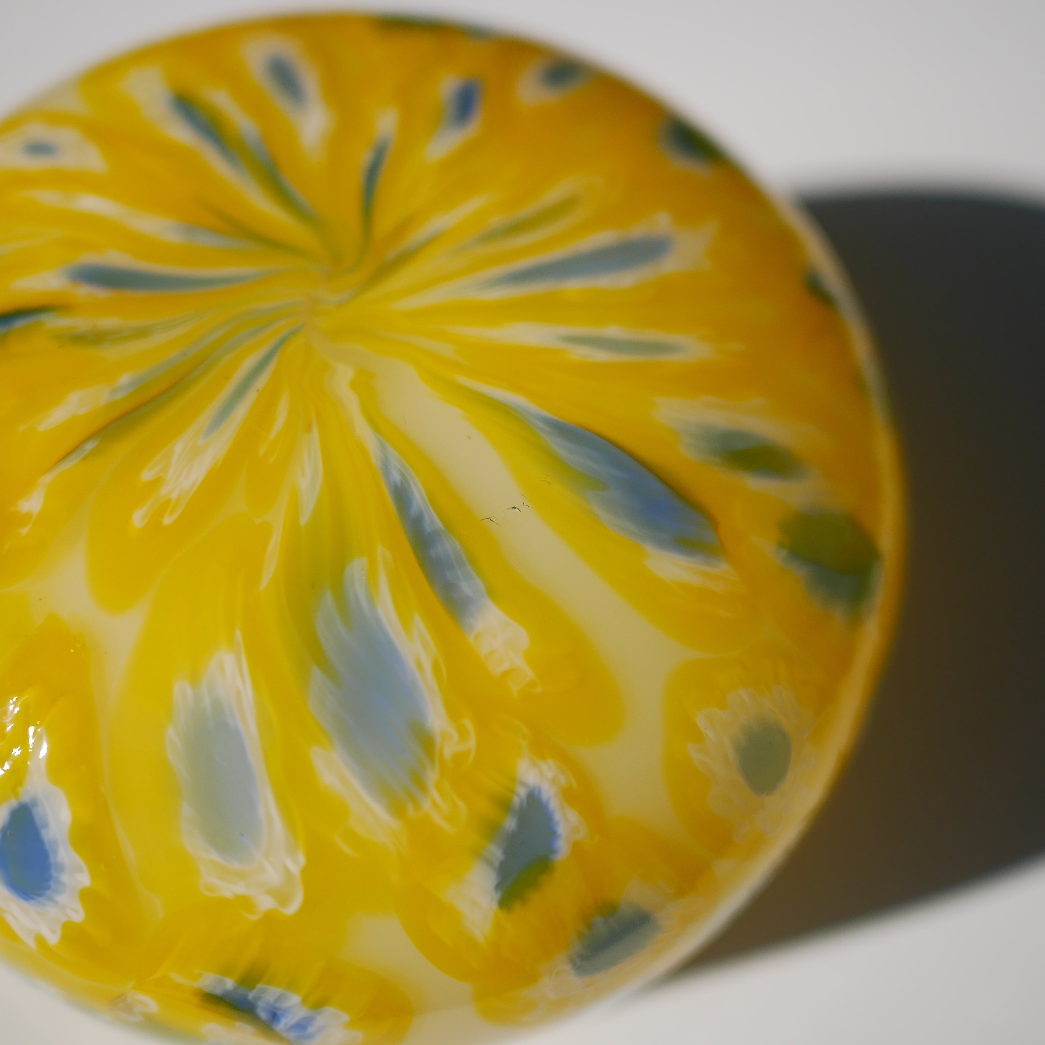 色ガラスの断面に現れる花のような模様を重ねていく技法で