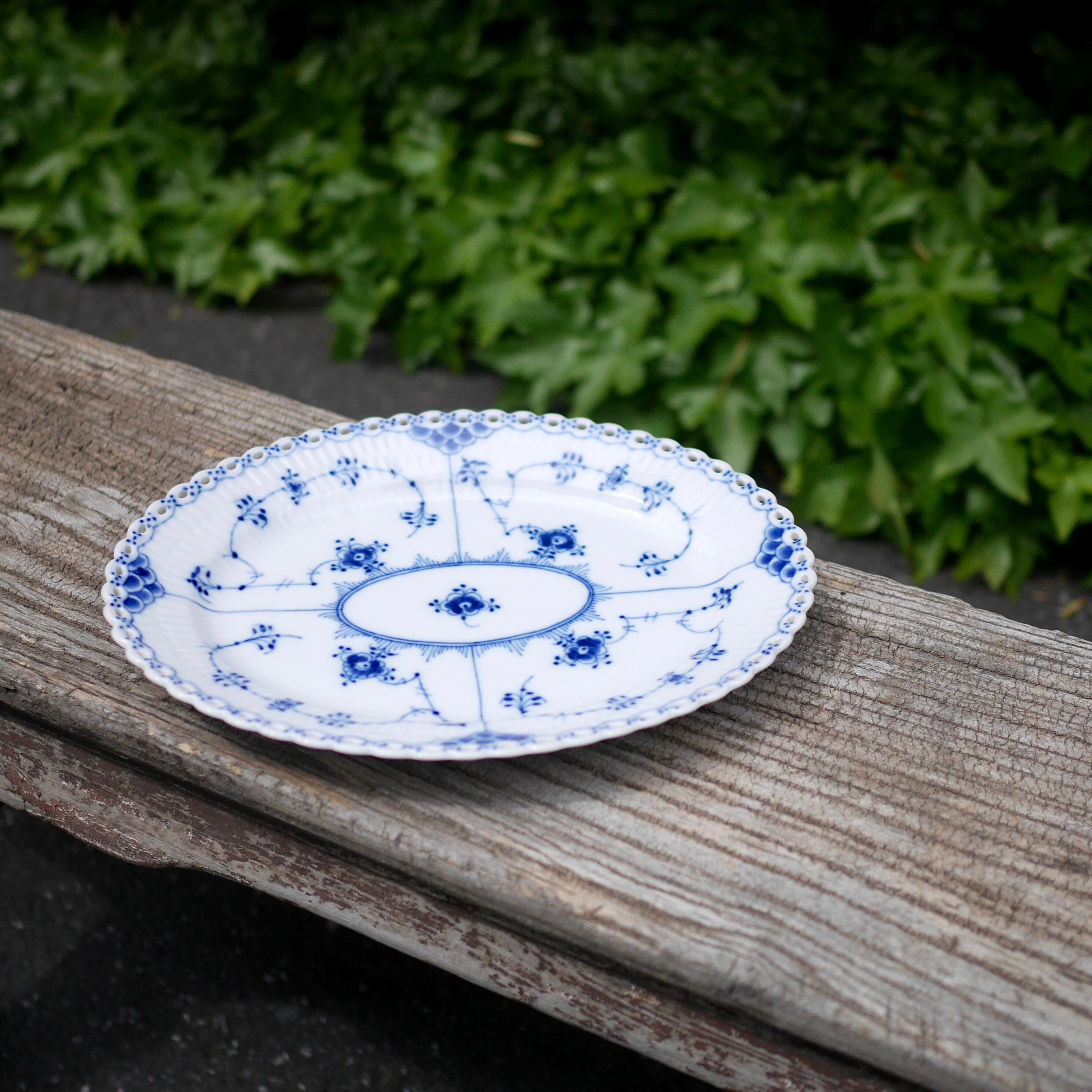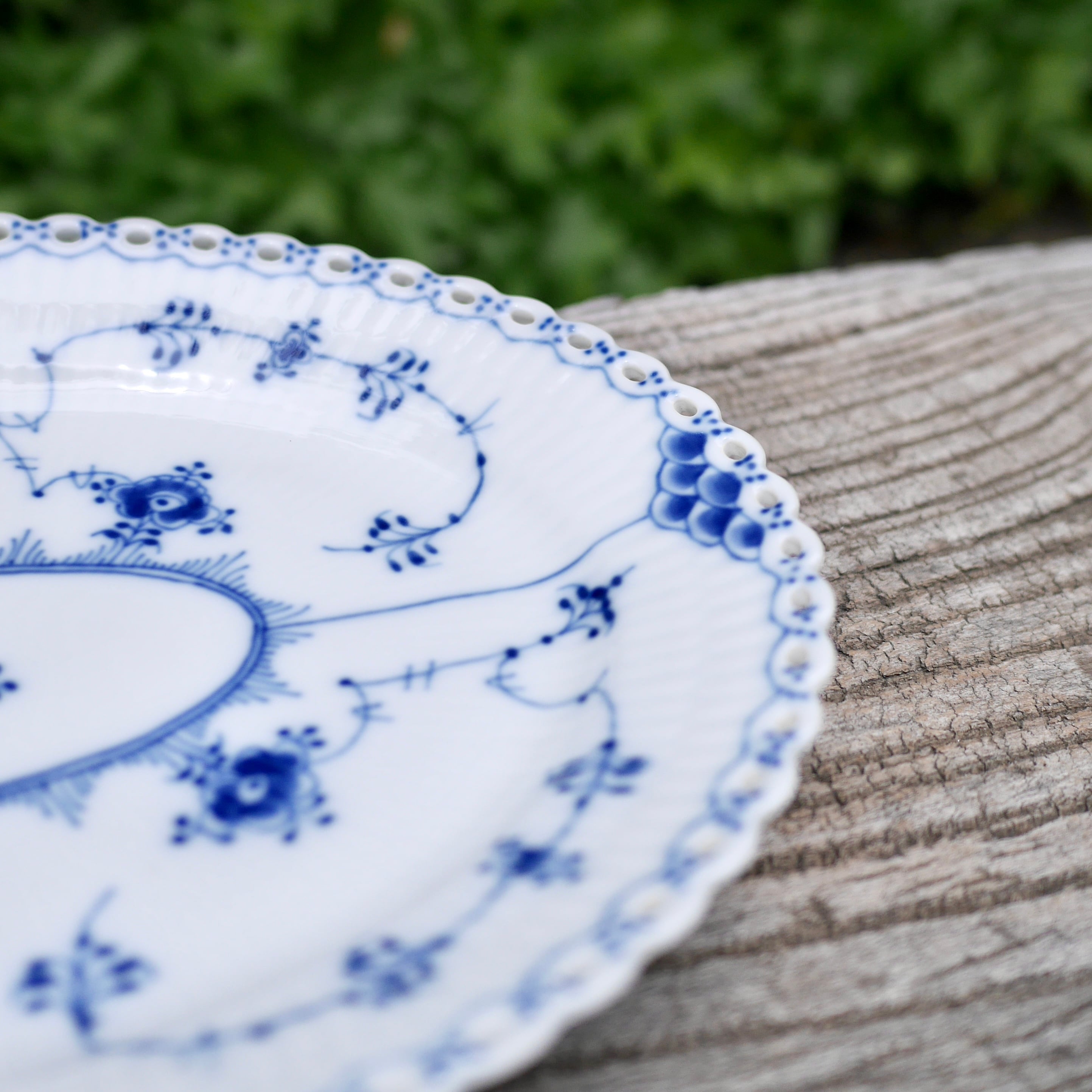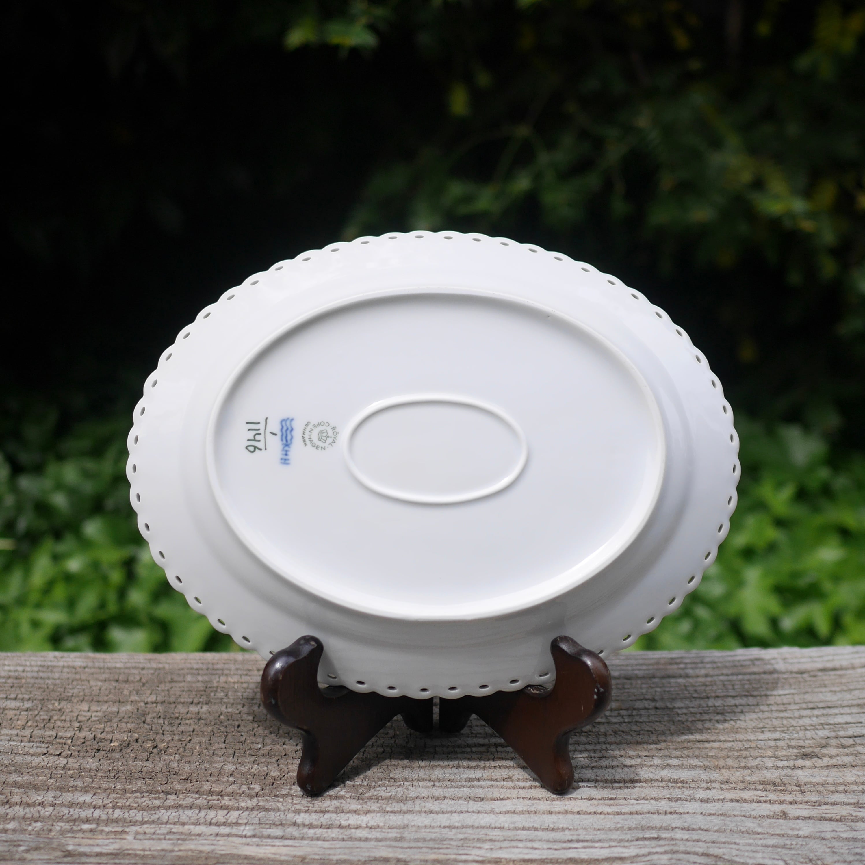 1885年に制作したブルーフルーテッド フルレースコレクションで魅せたロイヤルコペンハーゲンのクラフツマンシップを見事に体現した作品で、あらゆるテーブルに優美な雰囲気をもたらしてくれる、オープンワーク(透かしの入った)のレースの縁取り付のオーバルディッシュです。